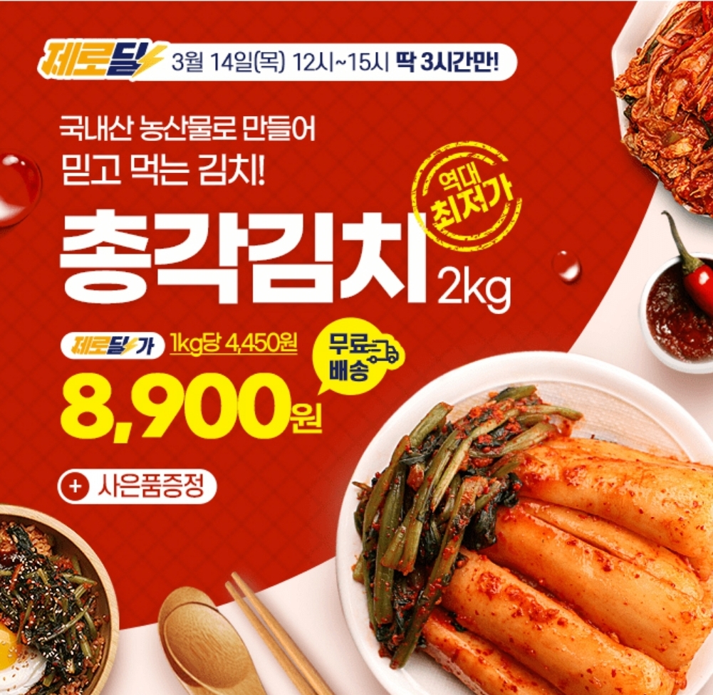 3시간 동안 진행되는 "캐시딜" 타임특가에서 국내산 제철 총각/포기/열무/열무물김치 2kg가 역대급 할인으로 8,900원+무료배송에 진행됩니다. 이 김치는 당일 생산한 국내산 김치로, ㅇ개(4kg)이상 구매시 고기포자만두,김치포자만두,손칼국수,손수제비 중 랜던 증정되어 초특가 혜택으로 구매 가능합니다. 빈칸에 들어갈 숫자는 무엇일까요?