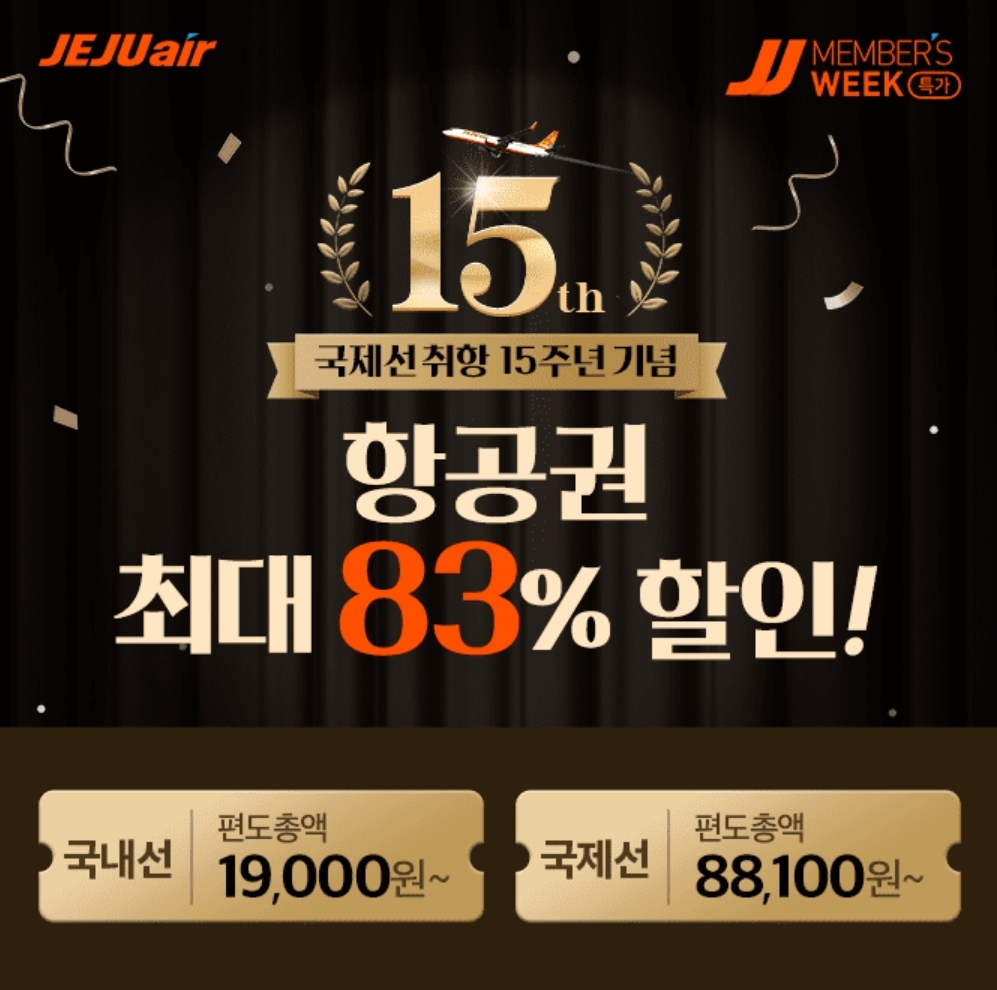 제주항공 국제선 취향 15주년 기념,멤버스위크가 항공권 최대 83% 할인으로 돌아왔어요! 항공권 추가 할인 코드, 신규회원 할인,결제할인은 기본! 지금 홈페이지에서 퀴즈참여하고 정답을 맞히면 리프레시 포인트 ㅇㅇㅇ% 당첨(최대 3천P) 댓글 달고 잔망루피 굿즈까지 받아가세요