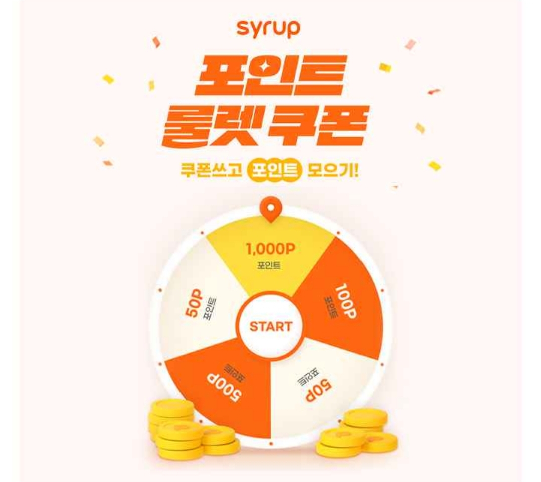 시럽의 포인트 룰렛 쿠폰 이벤트! 시럽에서 받은 쿠폰을 사용하면 룰렛을 돌릴 수 있는 참여 기회가 생겨요! 룰렛을 돌리면 00000 포인트를 드려요! 최대 1,000 포인트를 받을 수 있는 기회! (힌트: 영문대문자 +한글)