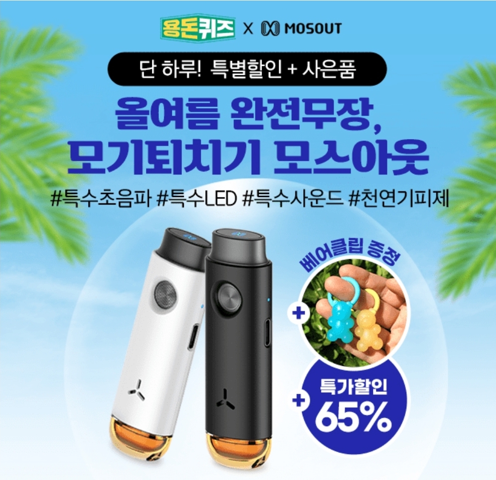 모스아웃은 멀티방어로 모기 해충을 퇴치하는 제품으로 초음파퇴치기, 사운드퇴치기, LED 퇴치기, 천연기피제 등의 제품들을 따로 구입 할 필요없이 4 IN 1으로 기능을 동시에 적용하 여 모기나 해충을 퇴치하는 제품입니다. 7월 용돈퀴즈 행사를 위해 가격할인과 함께 천연 방향제 0000 특별 사은품을 증정하고 있는 데, 빈칸에 들어갈 단어는 무엇일까요?