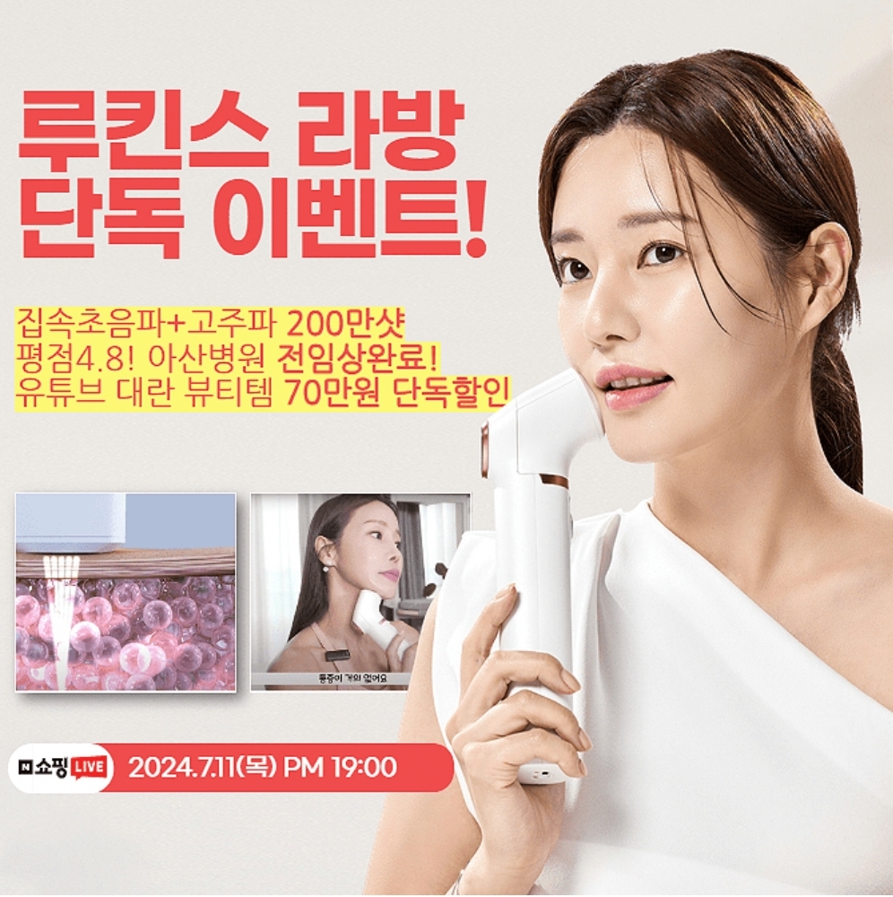 평점 4.8돌파~1,000개가 넘는 후기로 간증된 루킨스는 00000와 고주파로 즉각적인 피부 각도땡기기,모공,미백 개선이 가능해요! 원샷 원도트 조사로 무통증에 가까운 홈케어 뷰티디 바이스! 라이브 방송에서만 최대 할인+24개월 무이자 할부+페이백 이벤트까지, 오늘 저녁 7 시 네이버쇼핑라이브에서만 진행! 빈칸 안에 들어갈 단어는 무엇일까요?