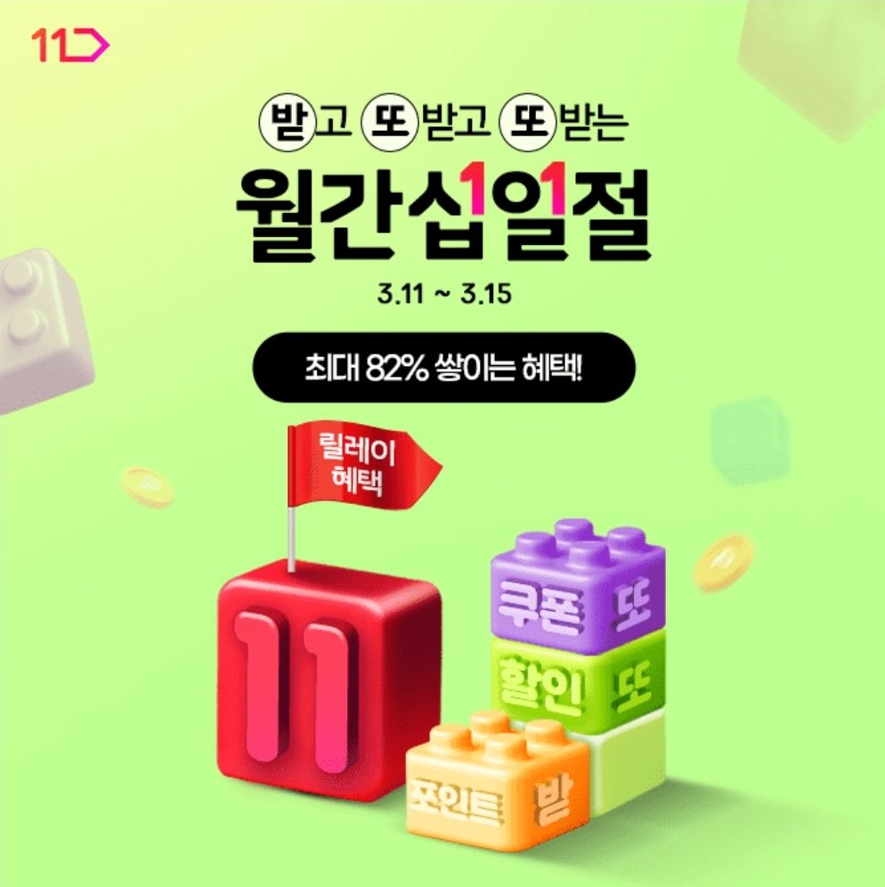 혜택 받고 또받고 또받고 11번가 월간십일절! 쓰면 쓸수록 할인 금액이 늘어나는 ㅇㅇㅇ 장바구니 쿠폰! 다음 쿠폰이 여러분을 기다리고 있어요~