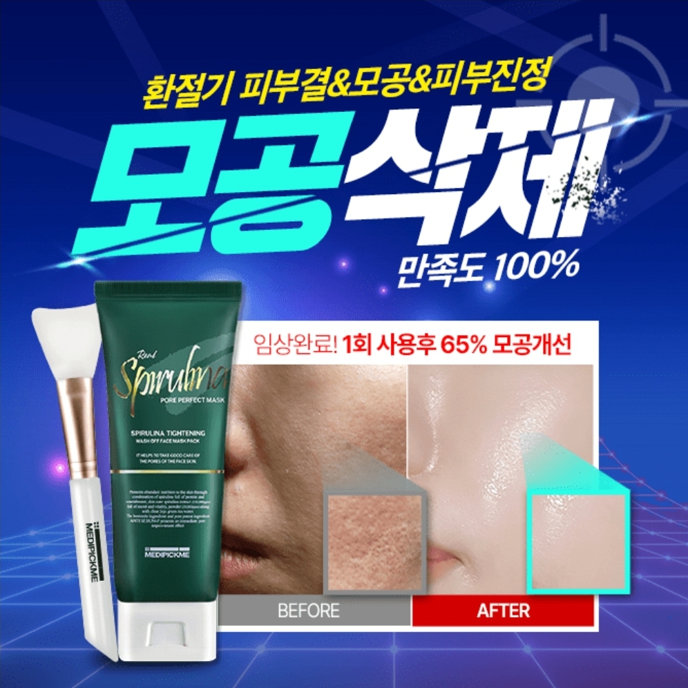 '메디픽미 스피룰리나 포어 퍼펙트 마스크'은 단 1회 사용만으로 즉각적인 진정 및 4중 모공개선 임상시험을 완료하였는데요! 모공을 확쪼여준다고 하여 이러한 애칭도 붙었다고 합니다. 이 제품의 애칭은 무엇일까요?(힌트 : ㅁㅉㅍ)