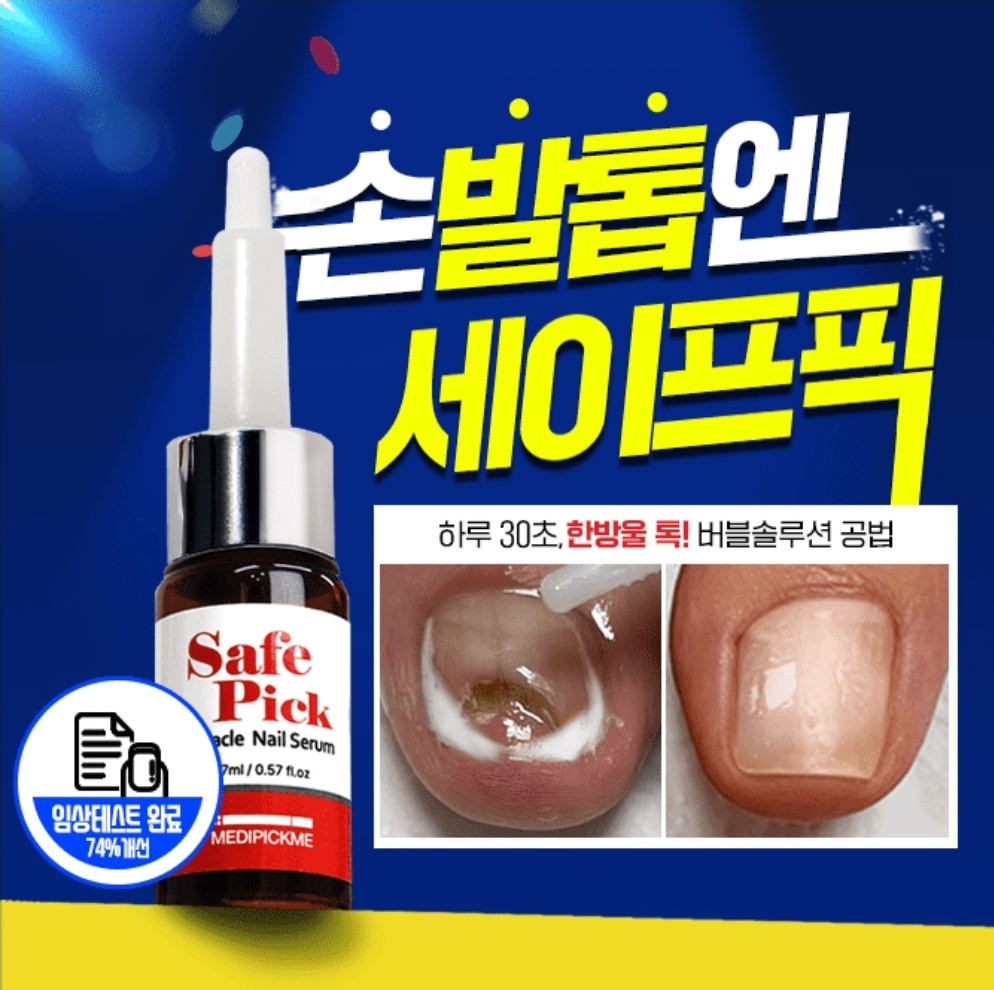 메디픽미 세이프픽 네일세럼'은 저자극 테스트를 완료한 제품으로, 변형되고 변색된 각종 손발톱 고민에 도움을 주는데요! 손발톱 조직 강화에 도움을 주는 'ㅇㅇㅇ' 성분과 특허성분이 포함되어 있습니다.