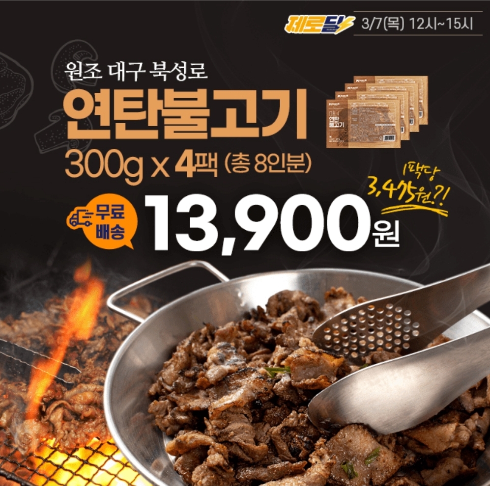 3시간 동안 진행되는 "캐시딜" 타임특가에서 대구 북성로 연탄불고기 300g*4팩(8인분)이 역대급 할인 13900원+무료배송에 진행됩니다.