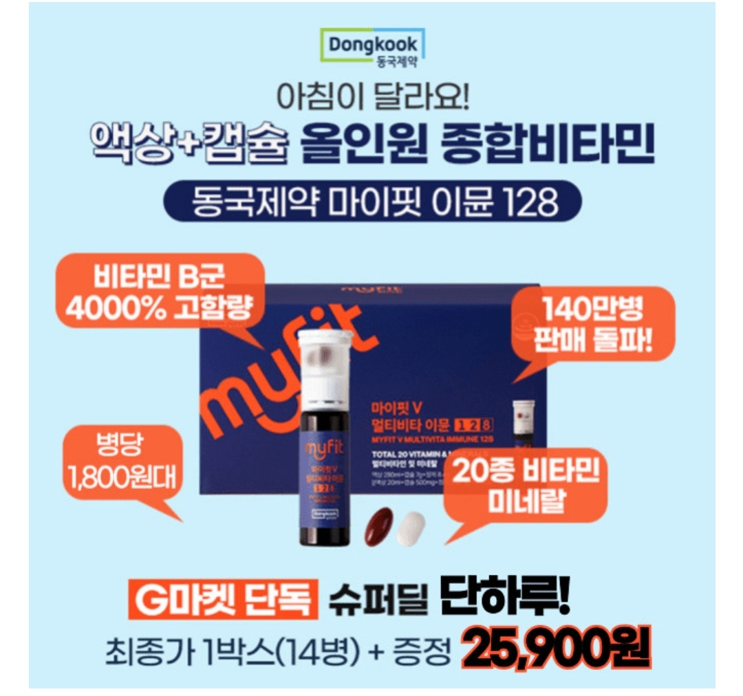 동국제약 마이핏 이뮨128은 20종 비타민 미네랄과 아연 등을 한번에 섭취할 수 있는 종합비타민이인데요! ㅇㅇ이 필요한 순간, 하루 한병으로 차오르는 에너지를 느껴보세요.
