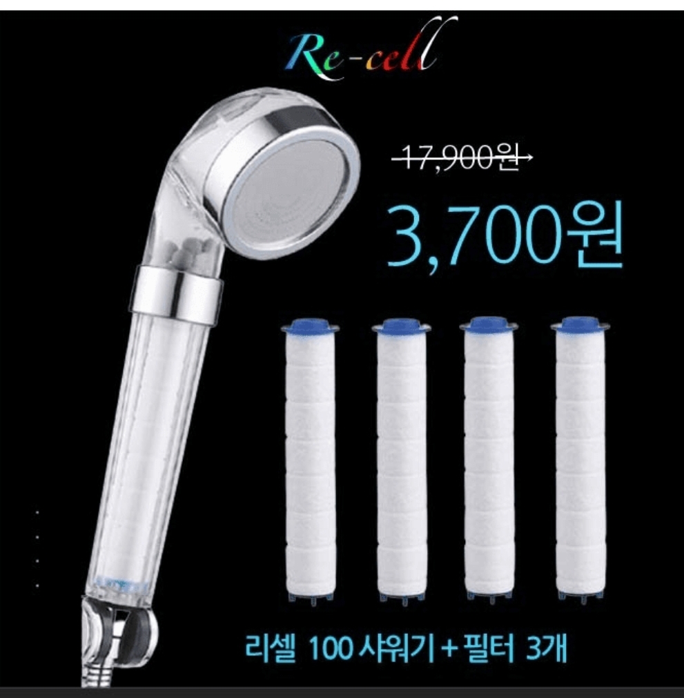 "리셀 100 녹물제거 샤워기"는 0단계 필터링 시스템 입니다. 0에 들어갈 단어는 무엇일까 요?