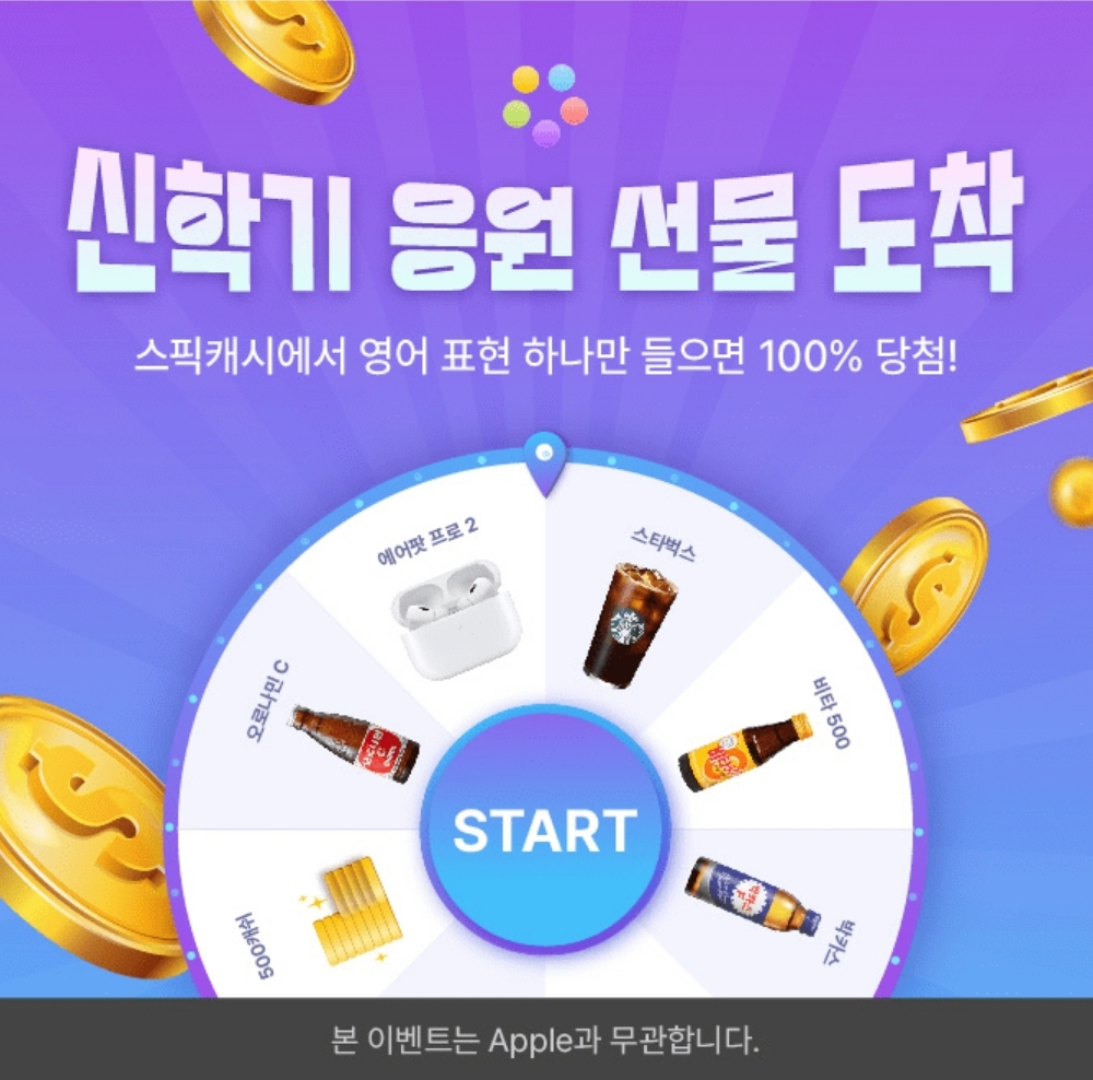 평소에 영어 회화 공부 시작조차 어려워셨나요? 스픽캐시가 도와줄께요. 지금 가입하면 신학기 응원 선물로 에어팟,스타벅스,비타500 등 기프티콘을 "즉시" 받을 수 있어요!