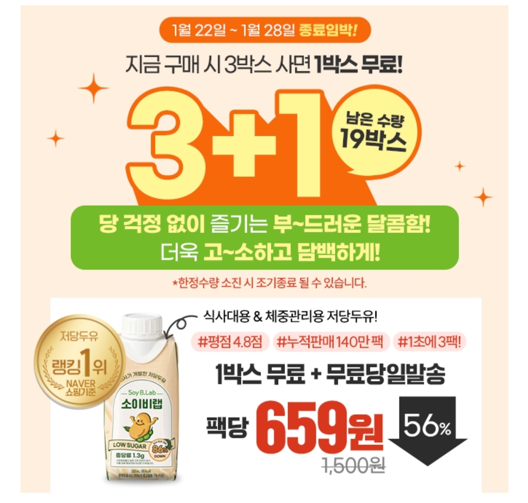 [1박스 무료 종료예정]누적판매량 140만팩,소이비랩 저당두유 1박스 무료증정 & 팩당 659원 혜택!(*남은수량 19박스)
