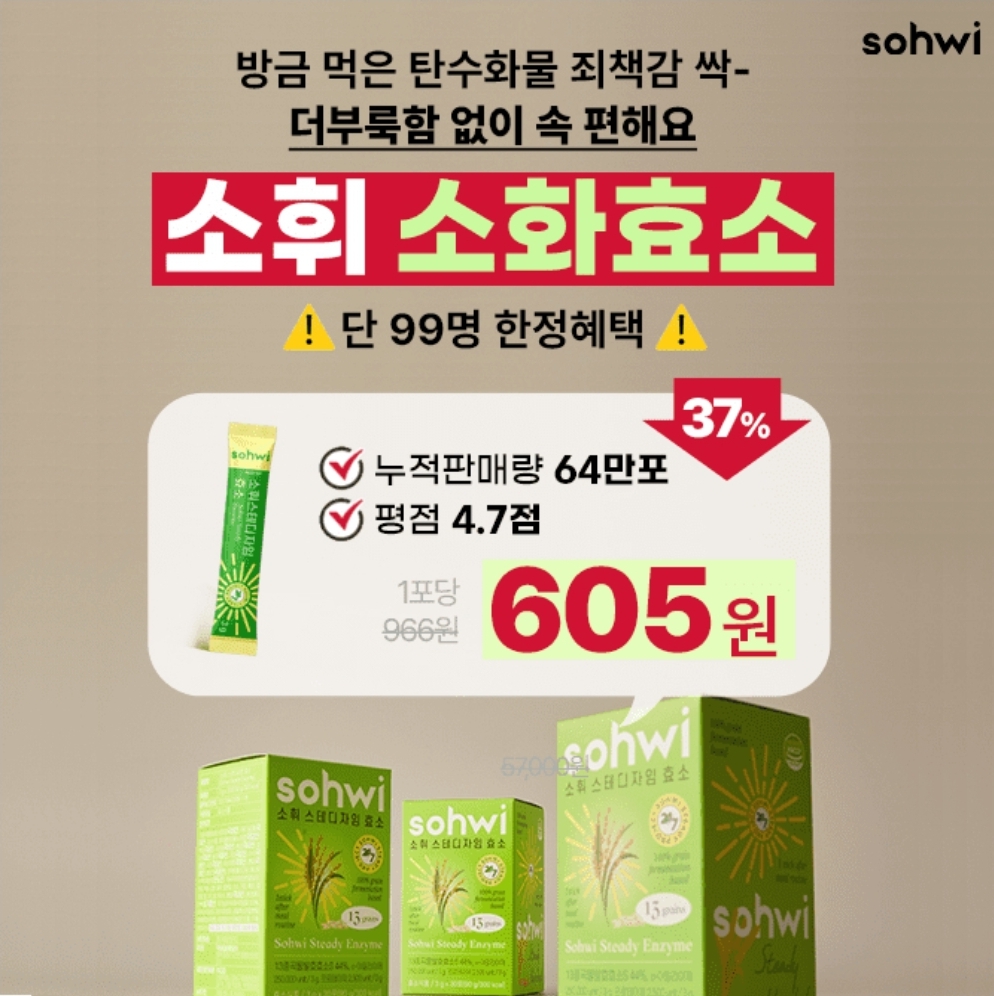 "외식하면 괴로워 하는 아내가 또 사달라고 하더라구요" 60만포 전량완판! 소휘 소화효소 단 99명 한정 포당 605원