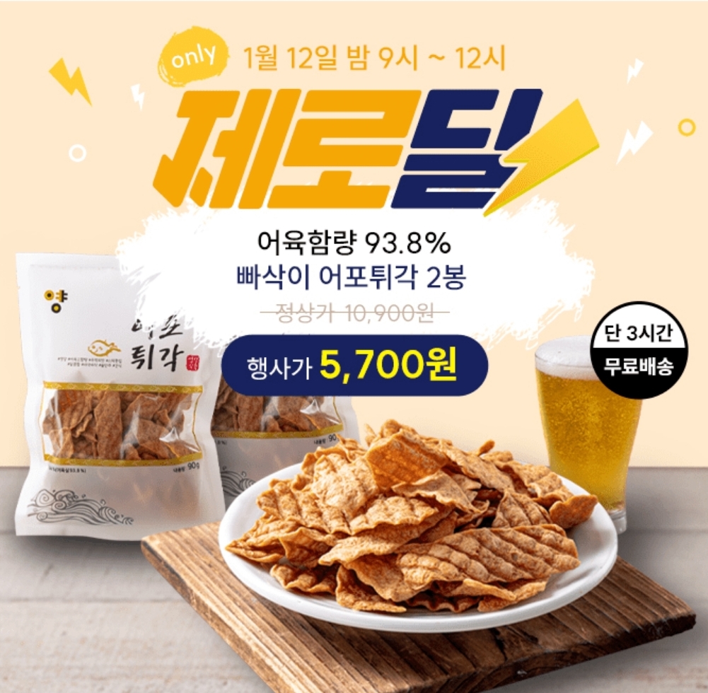3시간 동안 진행되는 "캐시딜" 타임특가에서 빠삭한 어포 튀간 90g x 2봉이 역대급 할인으로 5700원+무료배송에 진행됩니다.