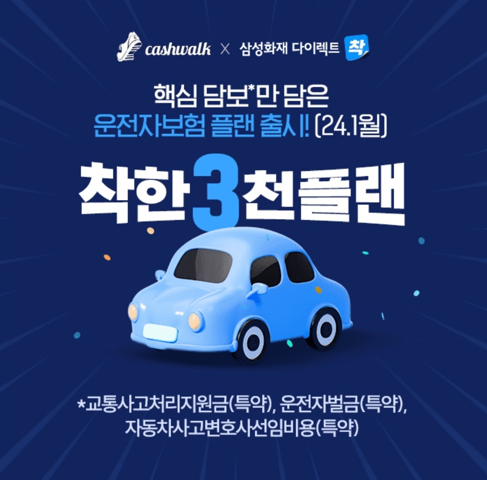 삼성화재 다이렉트에서 '24년 1월,운전자벌금(특약)과 ㅇㅇㅇㅇ처리지원금(특약),차동차사고 변호사선임비용(특약)을 보장하는 착한 3천플랜을 출시했습니다.