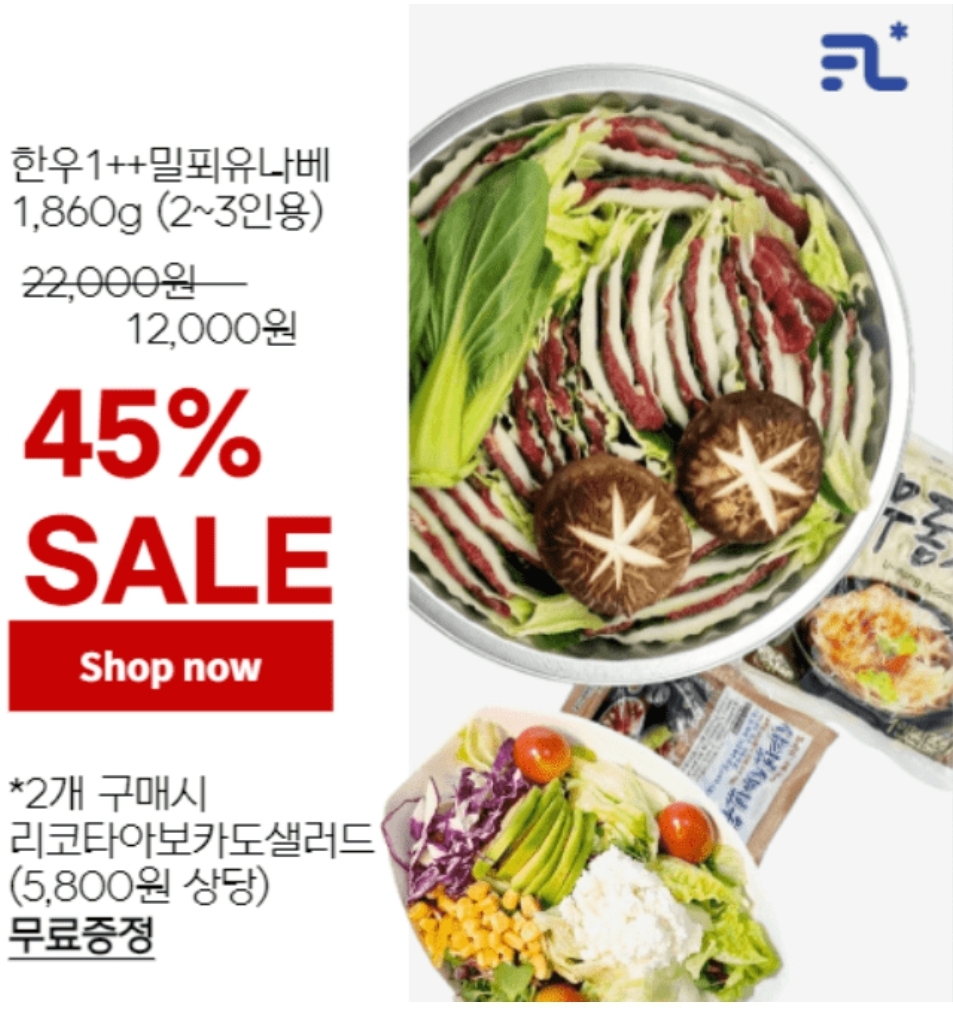 프레쉬리더 ㅇㅇㅇ 한우1++밀푀유나베45% 국내최저가 메가세일 이벤트 2개 구매시 리코타이보카도샐러드(5800원상당) 무료증정
