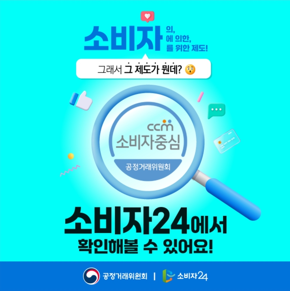 CCM(000중심경영) 인증제도' 는 상품의 기 획.판매 등 기업의 모든 활동이 얼마나 소비자 를 중심으로 이루어지고 있는지에 대해 인증하 는 제도로 공정거래위원회가 인증하고 한국소 비자원이 운영하고 있어요!