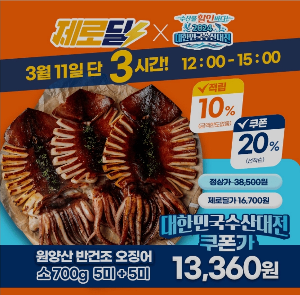 3시간 동안 진행되는 "캐시딜" 타임특가에서 국내 포항생산 원양산 반건조 오징어 10마리가 역대급 할인으로 16700원+무료배송에 진행됩니다. 이 오징어는 국립 수산물 ㅇㅇㅇㅇㅇ으로부터 품질을 인정받은 제품으로 해양수산부의 대한민국 수산대전 20%쿠폰과 10%적립도 적용되어 초특가로 구매 가능합니다.
