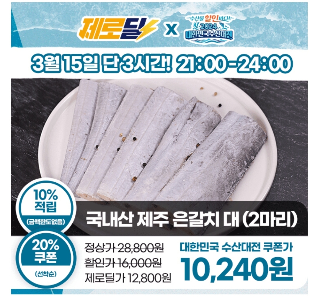 3시간 동안 진행되는 "캐시딜" 타임특가에서 제주바다에서 어획하고 손질한 은갈치 2마리(총420g)가 역대급 할인으로 12800원+20%쿠폰+무료배송에 진행됩니다. 이 갈치는 제주 갈치 ㅇㅇㅇ만평호 배에서 잡은 갈치로, 해양수산부의 지원을 받아 대한민국 수산대전 20%쿠폰과 10%적립도 적용되어 초특가로 구매 가능합니다.