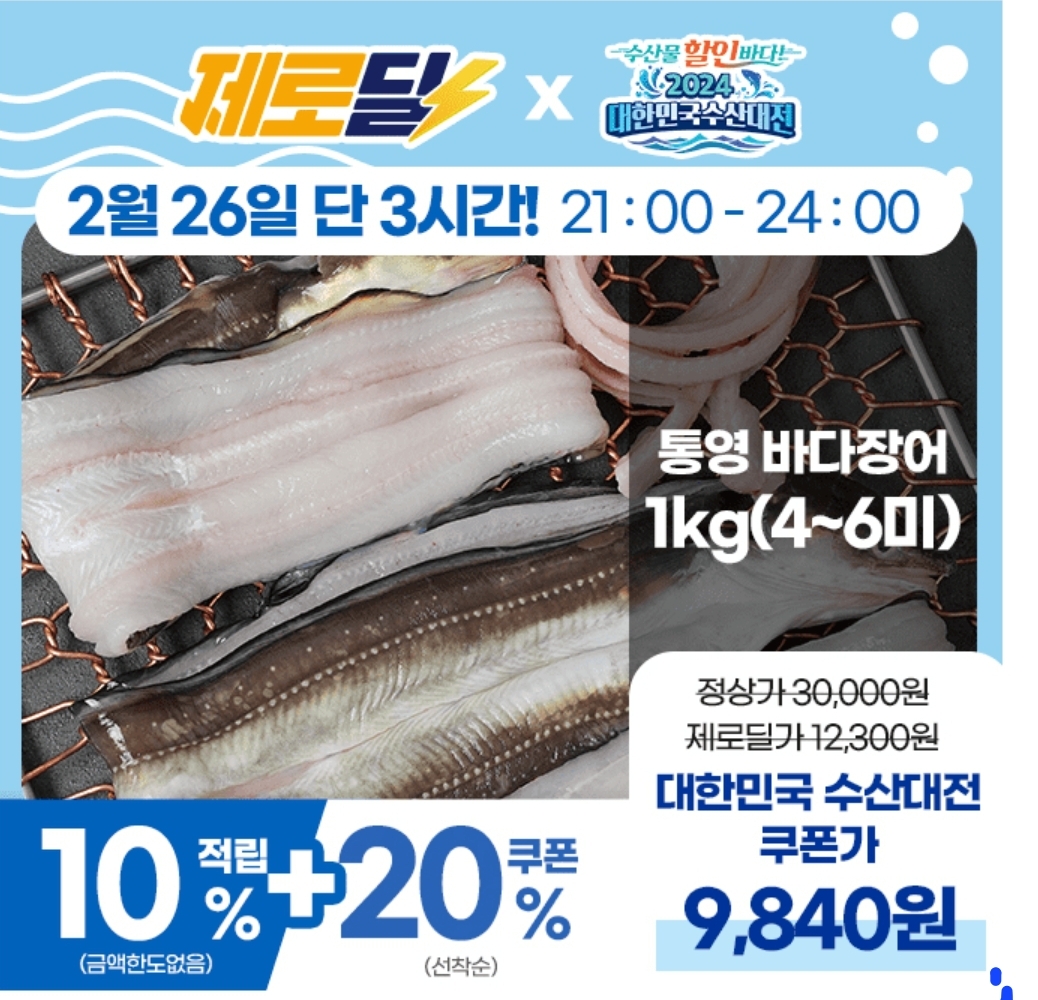 3시간 동안 진행되는 "캐시딜" 타임특가에서 국내산 손질 통영 바다장어 1kg이 역대급 할인으로 12300원+무료배송에 진행됩니다.