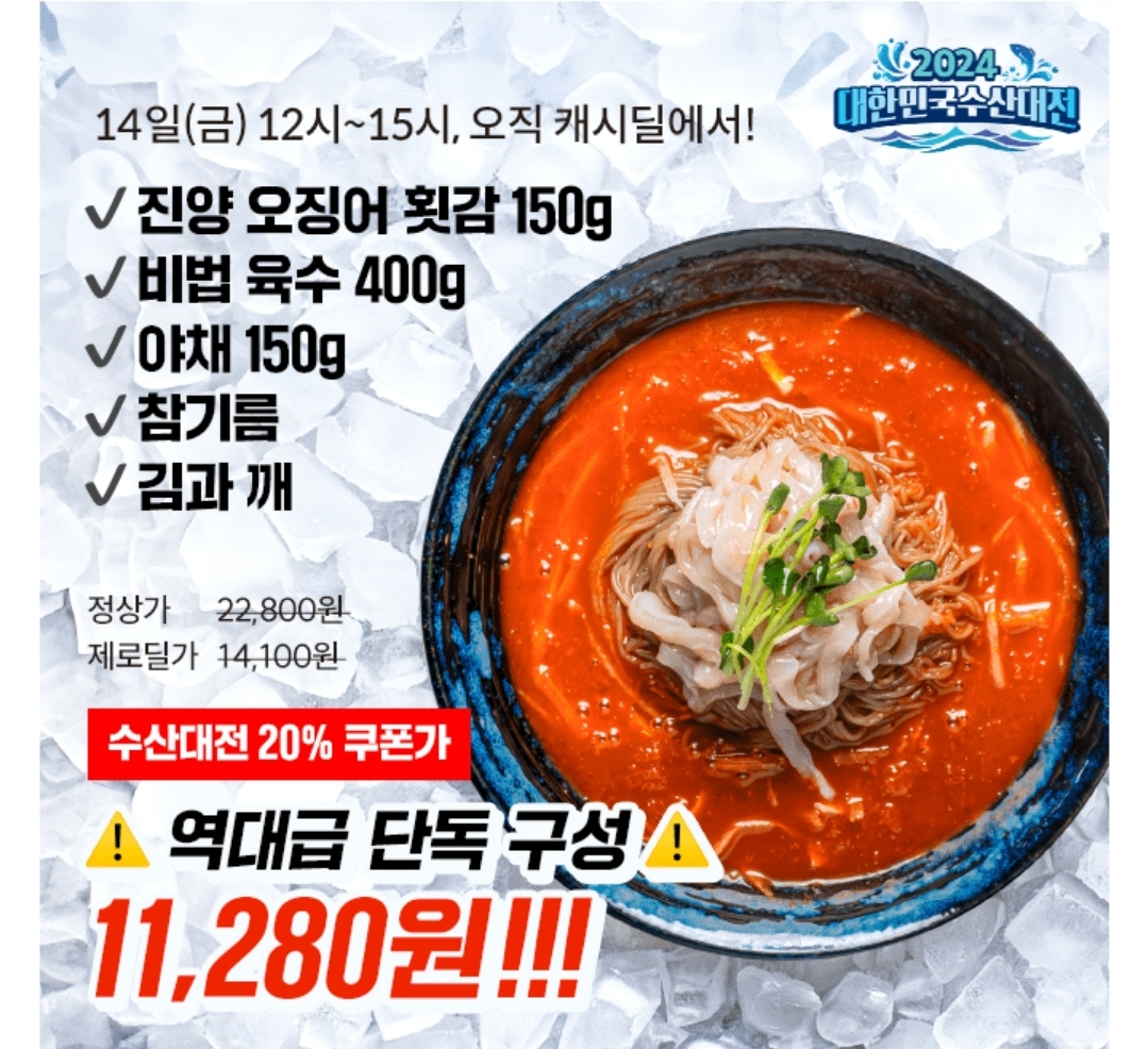 3시간 동안 진행되는 "캐시딜' 타임특가에서 속초 맛집! 진양 횟집의 오징어 물회 세트가 수산대전 20% 쿠폰가 11,280원+무료배송에 진행됩니다. 이 물회는 00년 전통의 소문난 속초 맛집 물회로 건강기능성 특허받은 새콤한 육수가 일품으로 오징어 회와 육수를 각각 구매해야 완벽한 물회를 즐길 수 있다고 합니다. 빈칸에 들어갈 숫자는 무엇일까요?