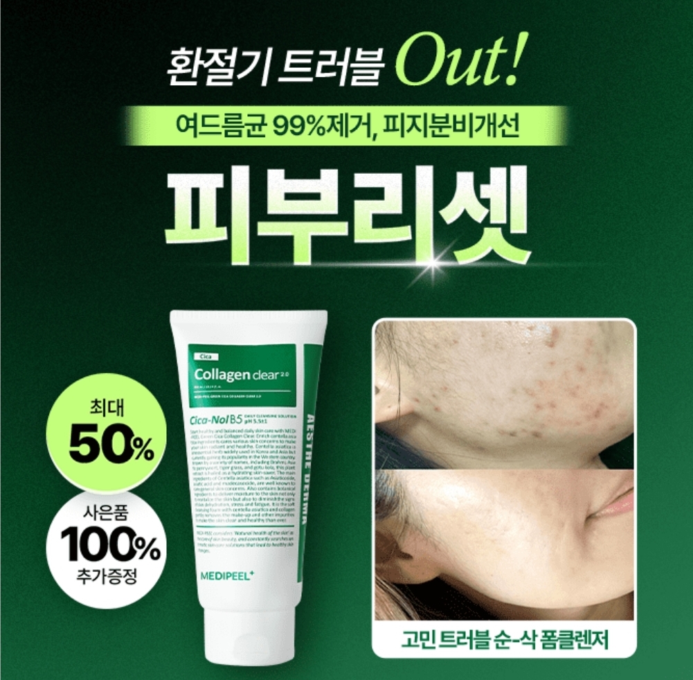 메디필의 여드름성 피부에 안심하고 사용할 수 있는 그린시카 콜라겐 클리어는 여드름균을 ㅇㅇ% 제거합니다.