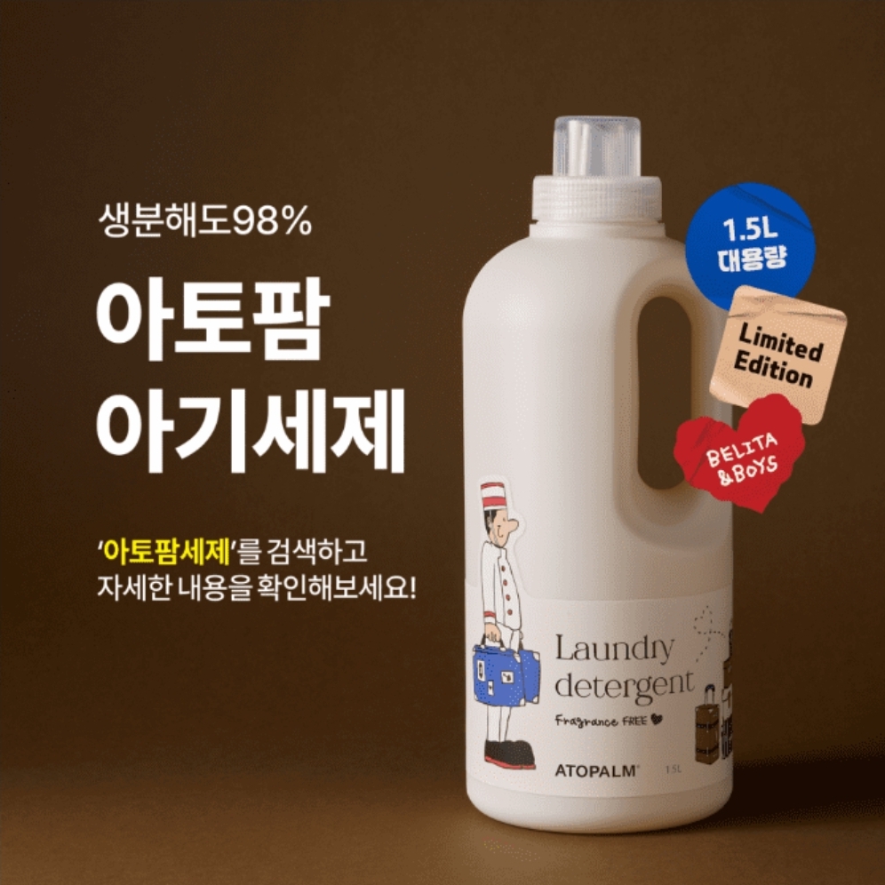 아토팜에서 만든 한정판 아기세제 30% 할인! 아토팜과 벨리타앤보이즈가 만나 000 한정 판으로 출시되었어요! 빈칸에 들어갈 정답은 무엇일까요? '아토팜 세제'를 검색하고 자세한 내용을 확인해보세요!