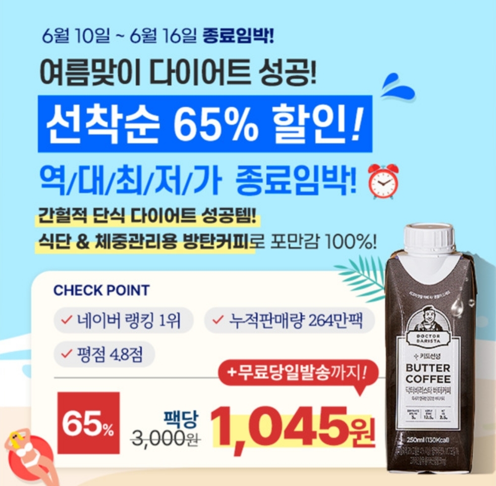 [종료임박] 간헐적 단식 다이어트 성공템 닥터바리스타, 여름맞이 선착순 65% 할인 & 역대최저가 팩당 1,045원 혜택이 곧종료돼요!