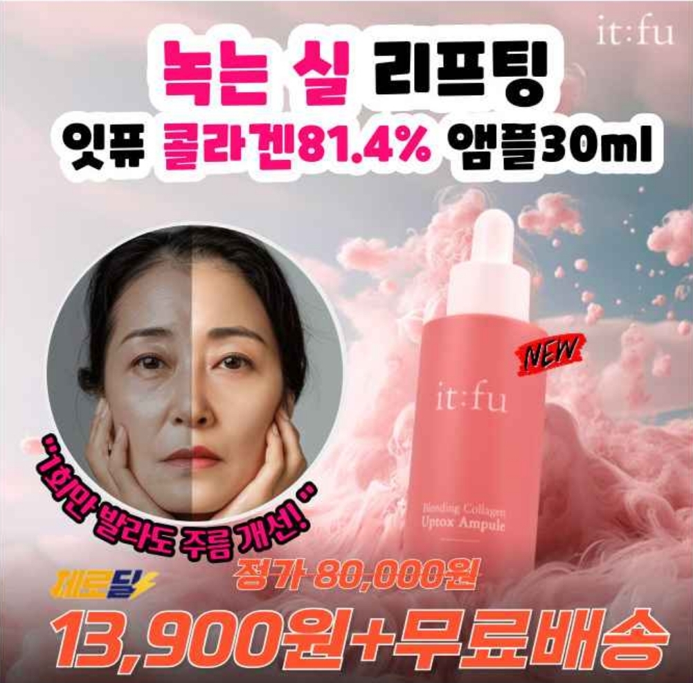 :신.상.등.장! 주름 짝- 탄력 업! 잇퓨 업톡스 앰플 30ml의 역대급 할인 13,900원+무료배송 업톡스 앰플은 피부나이를 어려지게 하는 000 3care 솔루션으로 리프팅 케어와 필업케어,링클케어에 효과적입니다 빈칸에 들어갈 글자는 무엇일까요? (힌트: ㄴㄴㅅ)