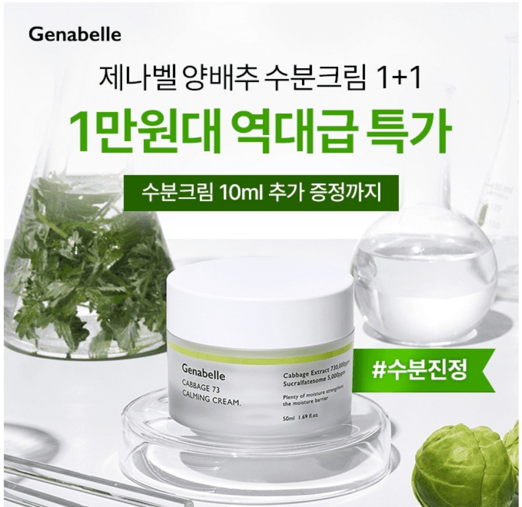 제나벨 양배추 수분크림 1+1 행사를 합니다. 무려 2개에 1만 원대입니다! 역대 최저가로 가져온 행상인 만큼 이 기회 절대 놓치지 마세요! 수분크림에는 피부 진정에 탁월한 양배추 추출물이 ㅇㅇㅇ,ㅇㅇㅇppm 함유되었습니다.