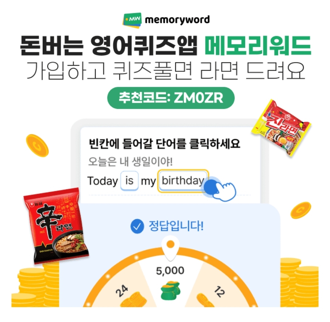 지금 메모리워드에서 퀴즈 1문제만 풀면 라면 증정
