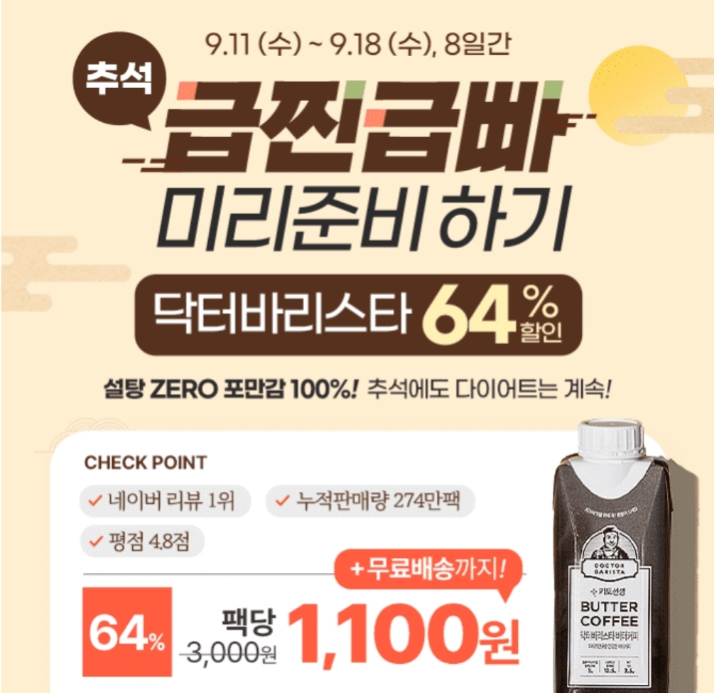 추석 급찐급빠 미리 준비하기! 설탕0g 포만감100% 닥터바리스타 방탄커피, 64% 할인 & 팩당 1,100원 특가!