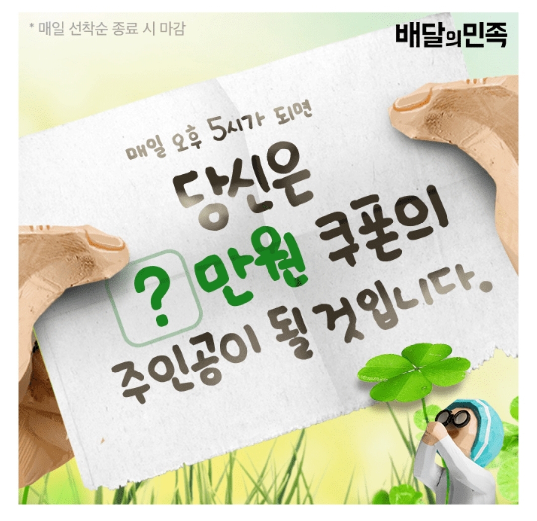 배달의민족에서는 오늘 오후 5시 000 2만원 선착순 쿠폰을 받을 수 있어요!