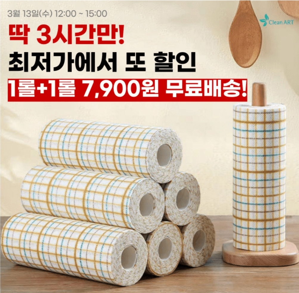 3시간 동안 진행되는 "캐시딜" 타임특가에서 30번 빨아쓰는 롤행주 1+1(총80매) 역대급 할인으로 7,900원+무료배송에 진행됩니다.