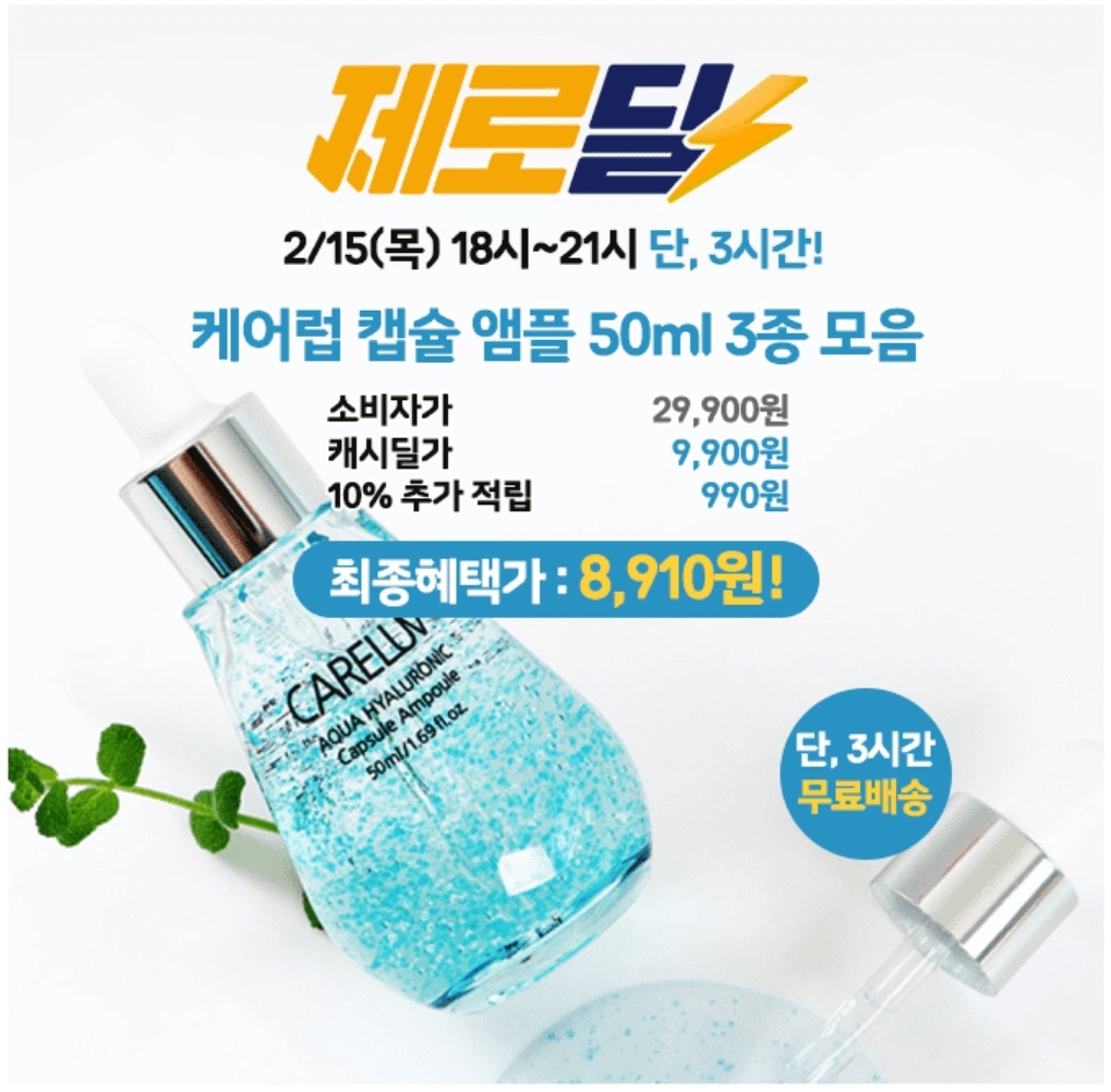 3시갸 도안 진행되는 제로딜 타임특가에서 케어럽 아쿠아 히알루로닉 앰플 에센스 세럼 50ml가 99,000원 무료베송 00%할인으로 진행됩니다. 빈칸에 들어갈 숫자는 무엇일까요?
