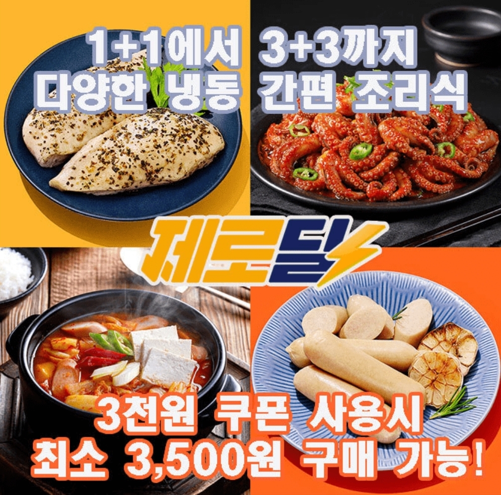 3시간 동안 진행되는 "제로딜" 타임특가에서 "BHC/스낵커스/푸드얍등 1+1 ~ 3+1 다양한 냉동 간편 조리식 부대찌개/핫도그/소시지/닭가슴살"이 최소 6,500원 ㅇㅇ% 할인으로 진행하고 3천원 쿠폰도 발급합니다. 빈 칸에 들어갈 숫자는 무엇일까요/