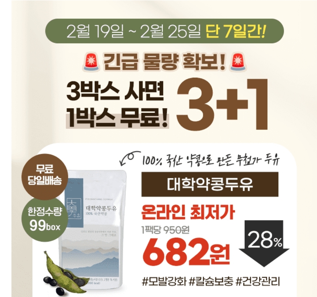 [무료증정]이벤트 문의 폭주 상품,대학약콩두유 긴급물량확보! 1박스 무료 & 온라인 최저가 팩당 682원(#단 99박스 한정!)