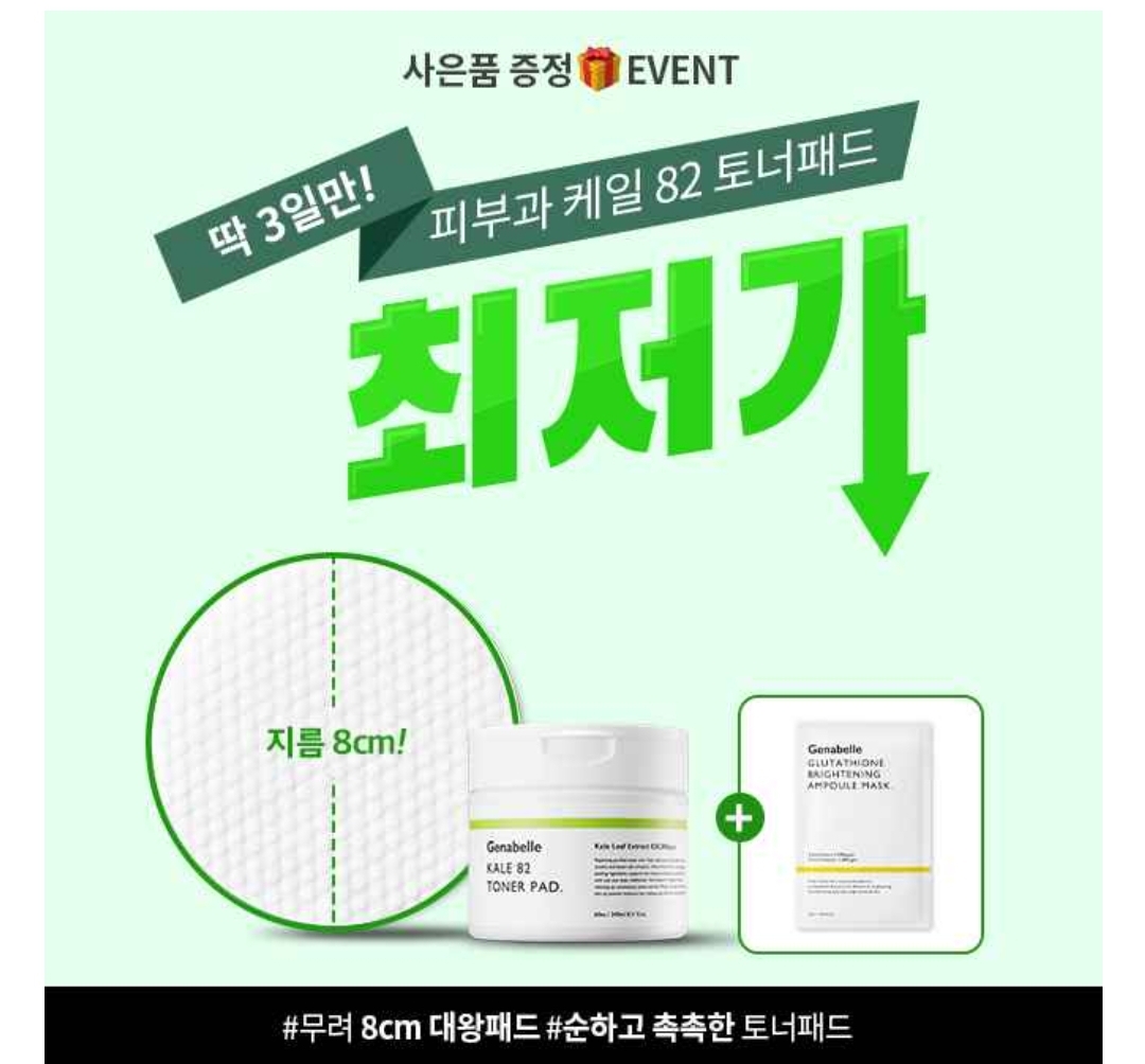 제나벨이 대왕 케일토너먼트 1+1행사와 글루타치온 마스크팩 사은품 증정까지 합니다. 한개에 1만원대에 가져갈 수 있는 기회 놓치지마세요! 토너패드에는 각질제거와 수분진정에 도움이 되는 케일잎추출물이 ㅇㅇㅇ,ㅇㅇㅇppm 함유되어있습니다.(힌트 : 숫자)
