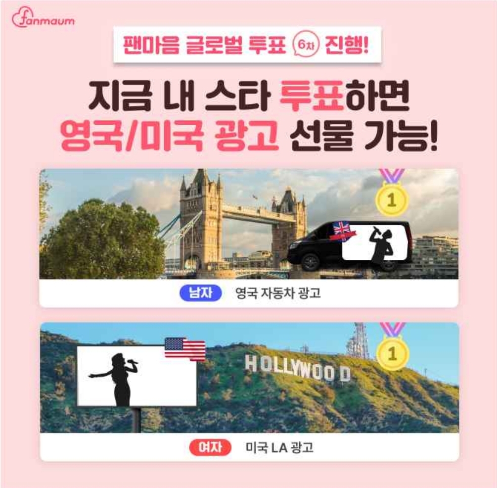 팬마음에서 내 스타 투표하면 영국/미국 광고 해드려요!