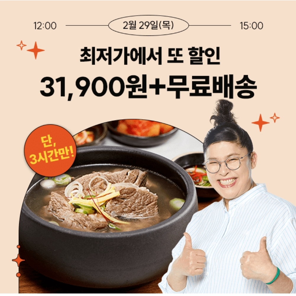 3시간동안 진행되는 캐시딜 타임특가에서 이영자가 추천하는 해화당 육개장 3팩 /차돌 된장찌개 3팩 /도가니탕 3팩 /갈비탕 5팩 택1이 역대급 할인 31900+무료배송에 진행됩니다.