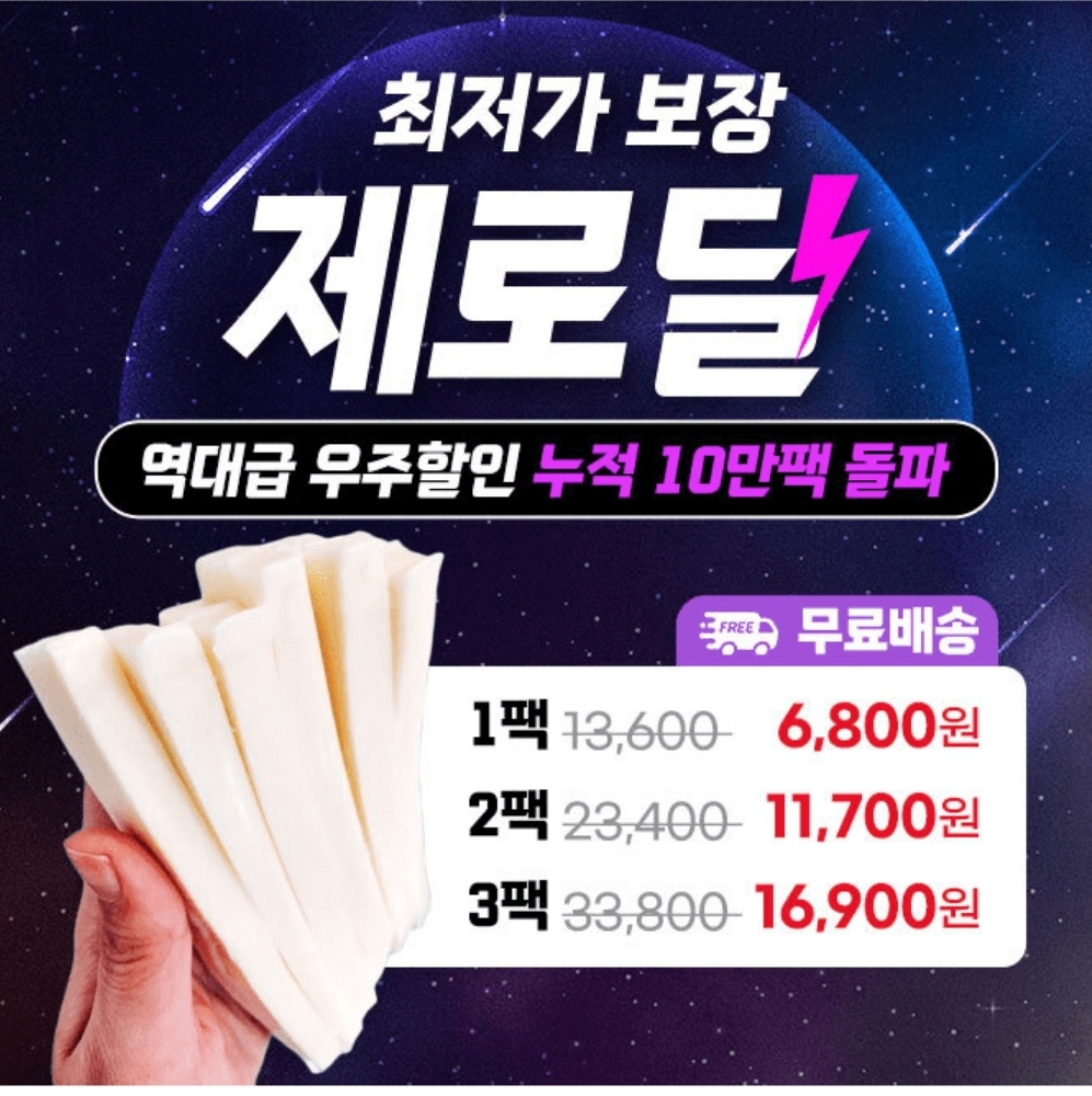 3시간동안 진행되는 제로딜 타임특가에서 목장에서 갓짠 원유로 대용량치즈 150g가 소비자가 9,800원 제로딜가 ㅇㅇㅇㅇ원 무료배송 30% 할인으로 진행됩니다. 빈 칸에 들어갈 숫자는 무엇일까요?