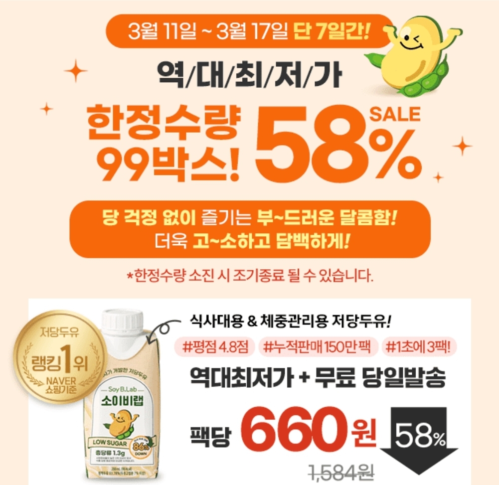 [99박스 한정] "누적판매량 150만팩" 소이비랩 한정수량 58% 할인 *수량 소진 시 종료*