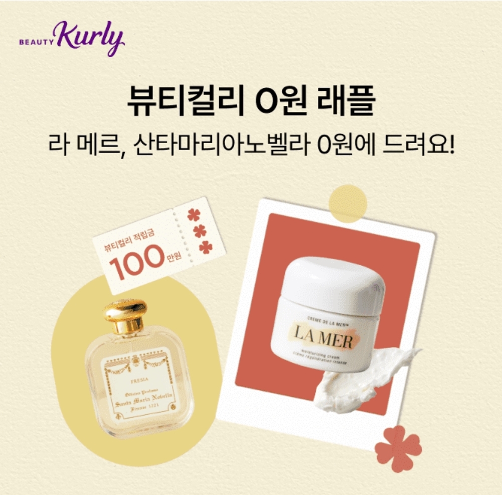 누구나 조건 없이 매일 응모 가능한 뷰티컬리 0원 래플이 열렸어요! 래플 당첨 시, 뷰티 걸리 적립금 100만원부터 라 메르 ㅇㅇㅇ 스킨케어 세트,산타마리아벨라 코롱, 맥 프라이머를 0원으로 드려요. 매일매일 응모 하면 당첨 확률이 올라가니 지금 바로 뷰티컬리에서 응모하세요,