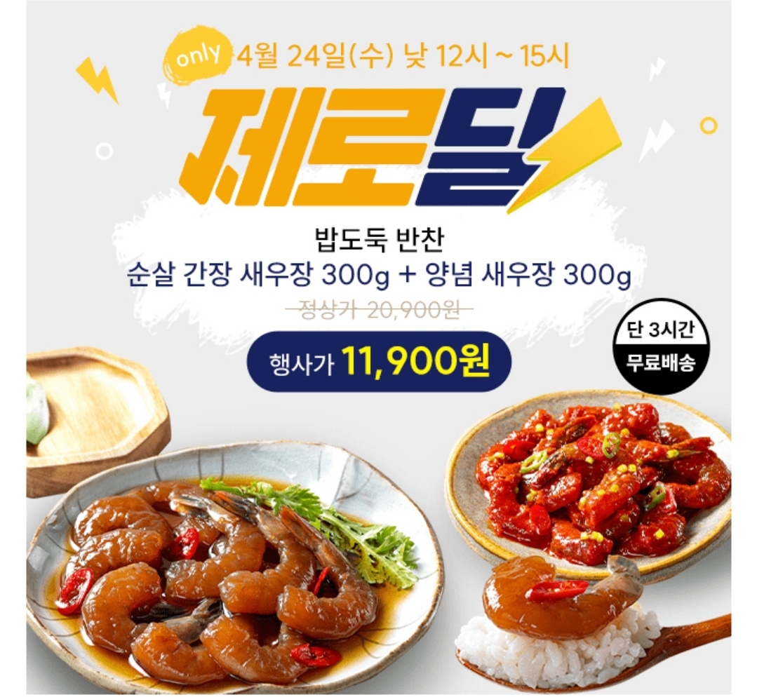 3시간 동안 진행되는 제로딜 타임특가에서 푸드앳홈 밥도둑 반찬 순살 간장 새우장 300g+양념 새우장 300g이 11900원+무료배송 역대급 ㅇㅇ% 할인으로 진행됩니다. 이 새우장은 머리와 껍질이 손질되어 있어 편하게 먹을 수 있고,만능 수제 소스로 만들어 중독되는 밥도둑 반찬이라고 합니다. 빈칸에 들어갈 숫자는 무엇일까요?