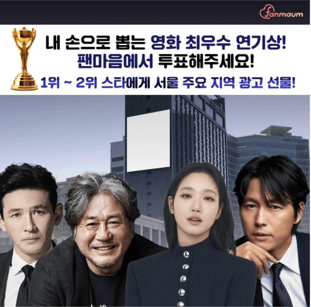 팬마음에서는 ㅇㅇ예술대상 영화 최우수연기상 수상할 것 같은 배우 순위투표를 진행하고 있어요.