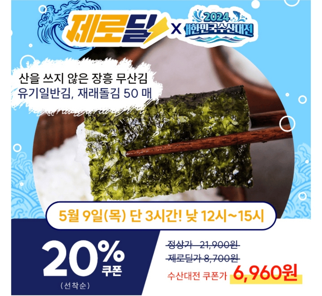3시간 동안 진행되는 "캐시딜" 타임특가에서 장흥무산김 재래돌김 재래김 일반김 50매/ 100매가 역대급 00% 할인으로 8700원+20%쿠폰+무료배송에 진행됩니다. 요즘금값이 된 김을 대한민국 수산대전 20% 쿠폰 적용시 6960원에 구매 가능합니다. 빈칸에 들어갈 숫자는 무엇일까요?
