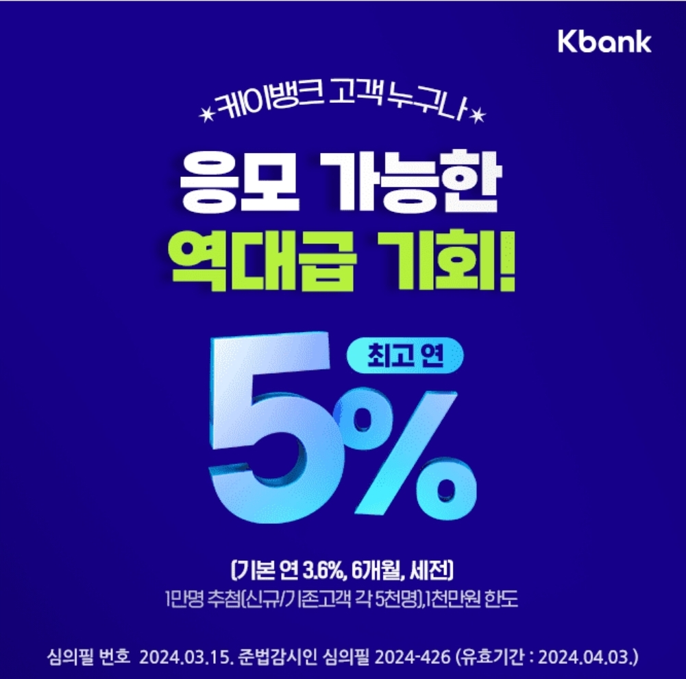 천만은행 케이뱅크는 1만명을 추첨하여(신규/기존고객 각 5천명) 최고 연 5%(기본 연3.6%,6개월,세전,1천만원원 한도)
