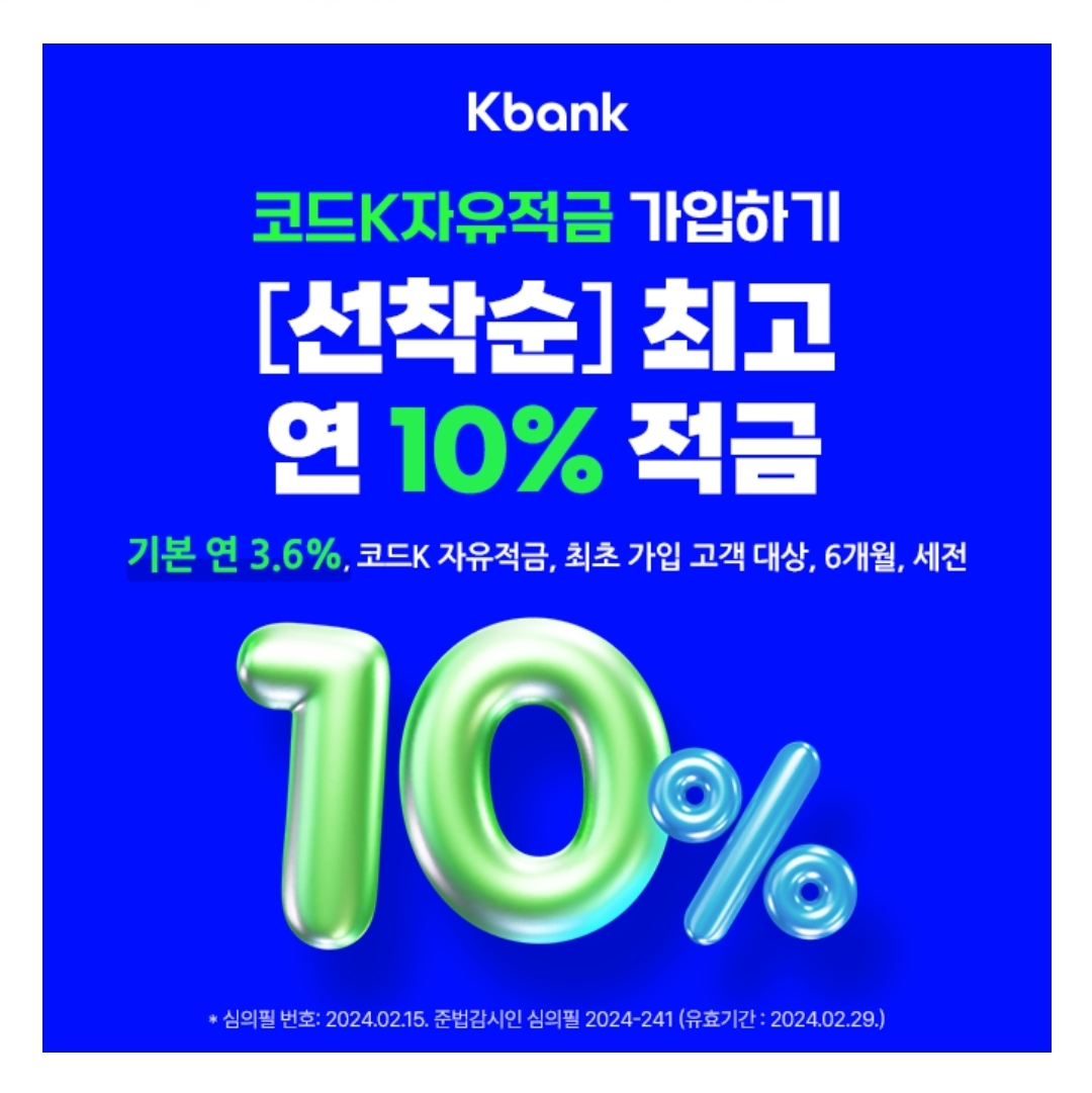 케이뱅크가 처음인 신규 고객이면 최고 연10%(기본 연3.6%,6개월,세전) 코드K 자유ㅇㅇ을 가입할 수 있는 금리우대코드를 받을 수 있는데요, ㅇㅇ에 들어갈 단어는 무엇일까요?(초성 힌트 : ㅈㄱ)