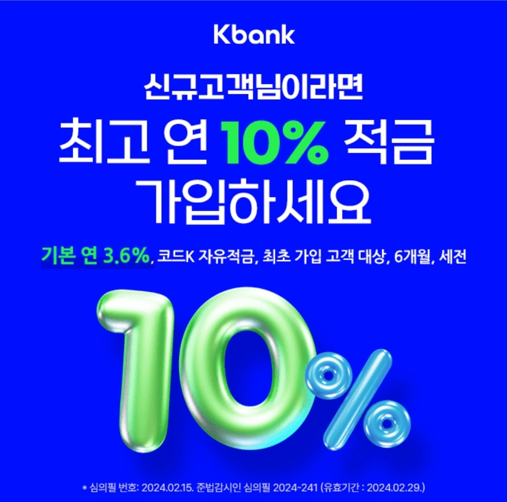 케이뱅크가 처음인 신규 고객이면 최고 연10%(기본 연3.6%,6개월,세전) 코드K 자유ㅇㅇ을 가입할 수 있는 금리우대코드를 받을 수 있는데요, ㅇㅇ에 들어갈 단어는 무엇일까요?(초성 힌트 : ㅈㄱ)