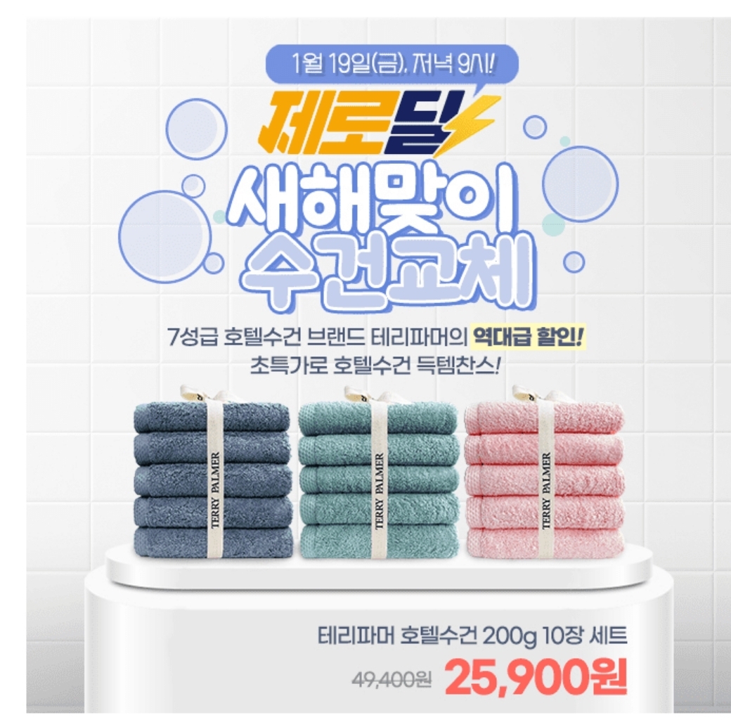 3시간 동안 진행되는 "캐시딜" 타임특가에서 테리파머 무형광 고중량 200g 호텔수건 10장 수건세트가 역대급 할인으로 25900원+무료배송에 진행됩니다.