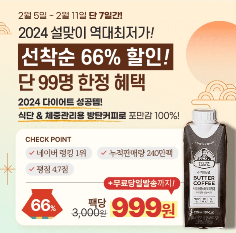 [선착순 99명] 식단&체중관리용 방탄커피 닥터바리스타! 2024 설맞이 역대최저가 팩당 999원 & 선착순 66%할인!
