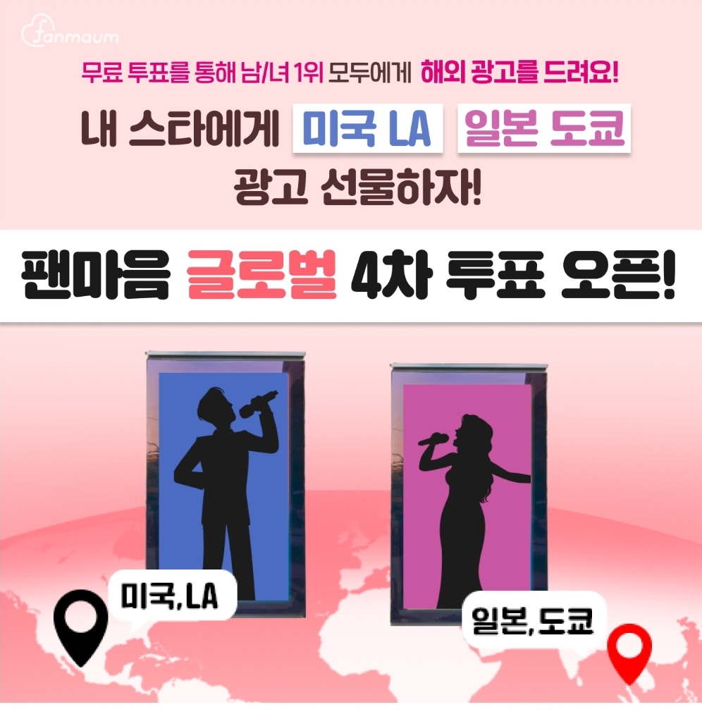 팬마음 글로벌 투표 4차에서 1위를 달성한 남자 스타에게는 할리우드 중심부에 ㅇㅇ ㅇㅇ 광고를 선물해드려요!