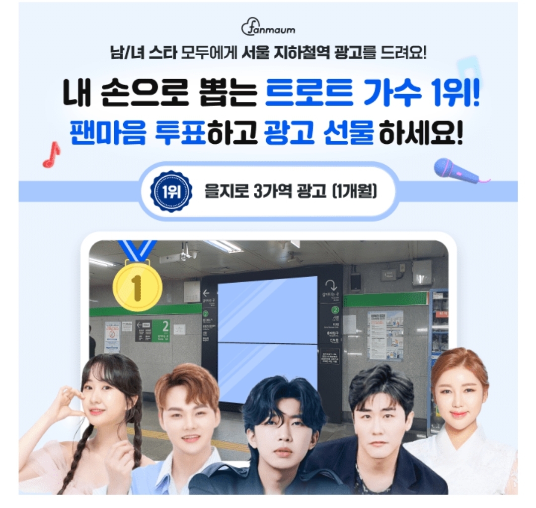팬마음 트로트 스타 20차 투표 1위 스타에게는 다양한 맛집, 청계천이 있는 00000역에 벽면 광고를 30일동안 해드려요!
